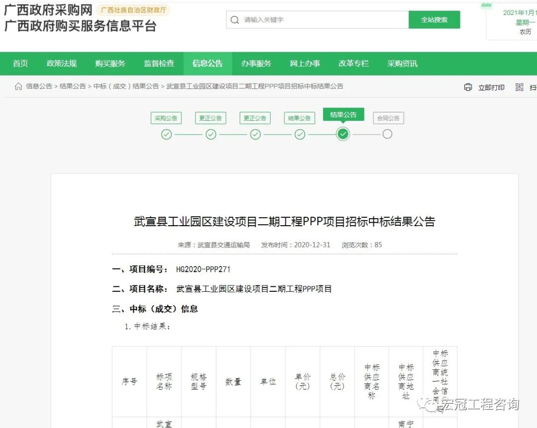 近期,由云开·kaiyun(中国)体育官方网站代理的武宣县工业园区建设项目二期工程PPP项目顺利完成开评标、合同预谈判、预中标公示、发布中标结果公告和发出中标通知书、合同谈判,标志着武宣县PPP项目圆满落地。